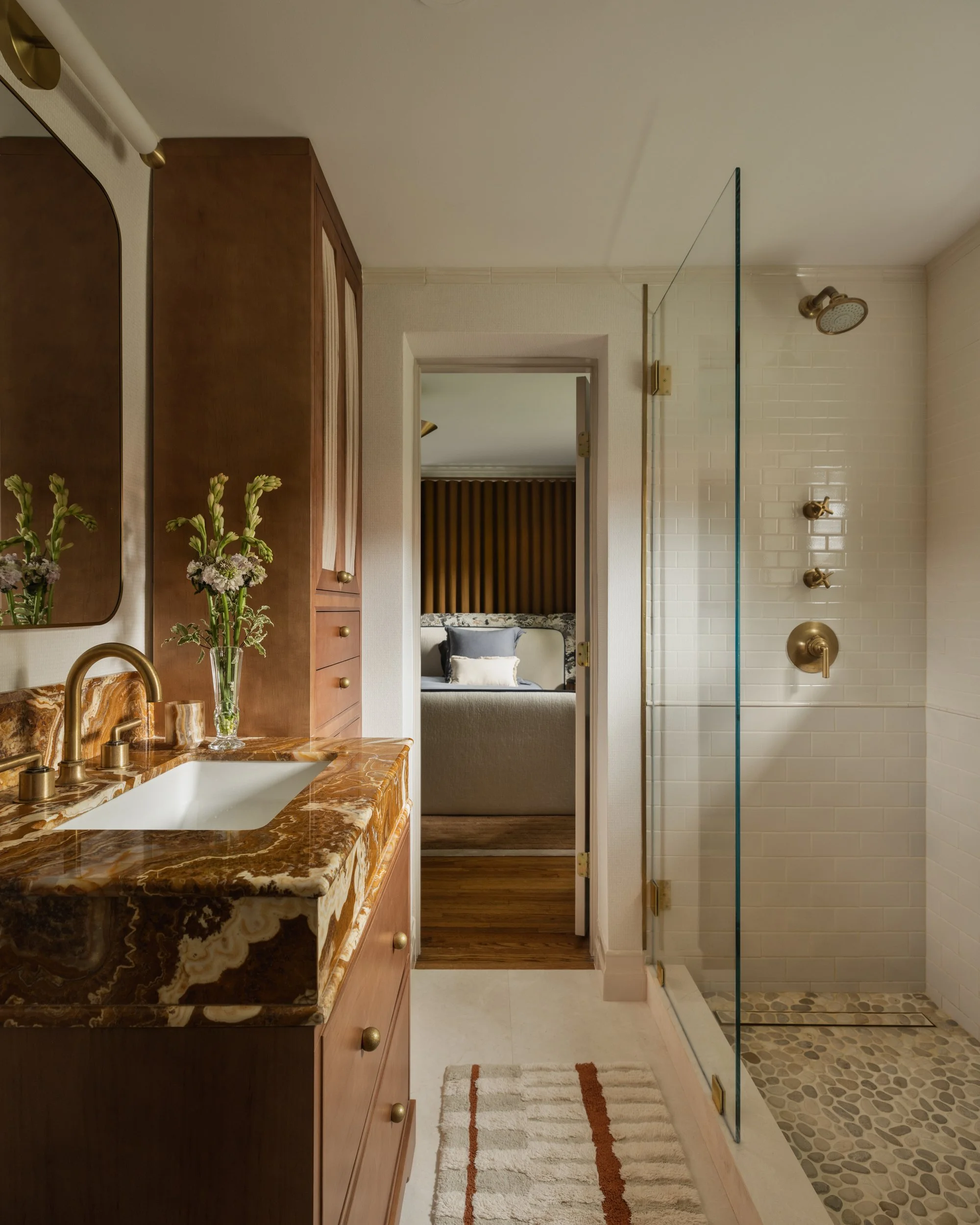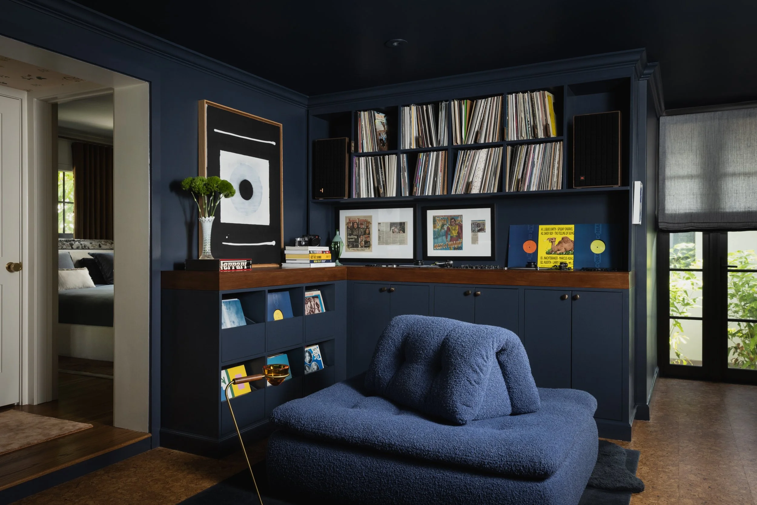 Wrapped in Benjamin Moore’s Hale Navy, the room feels immersive and moody, its custom walnut counters finished with Plank hardware. Restored cork flooring lends both warmth and acoustic depth. Layered details infuse the room with both personality and patina, making it as much a sanctuary as a stage.